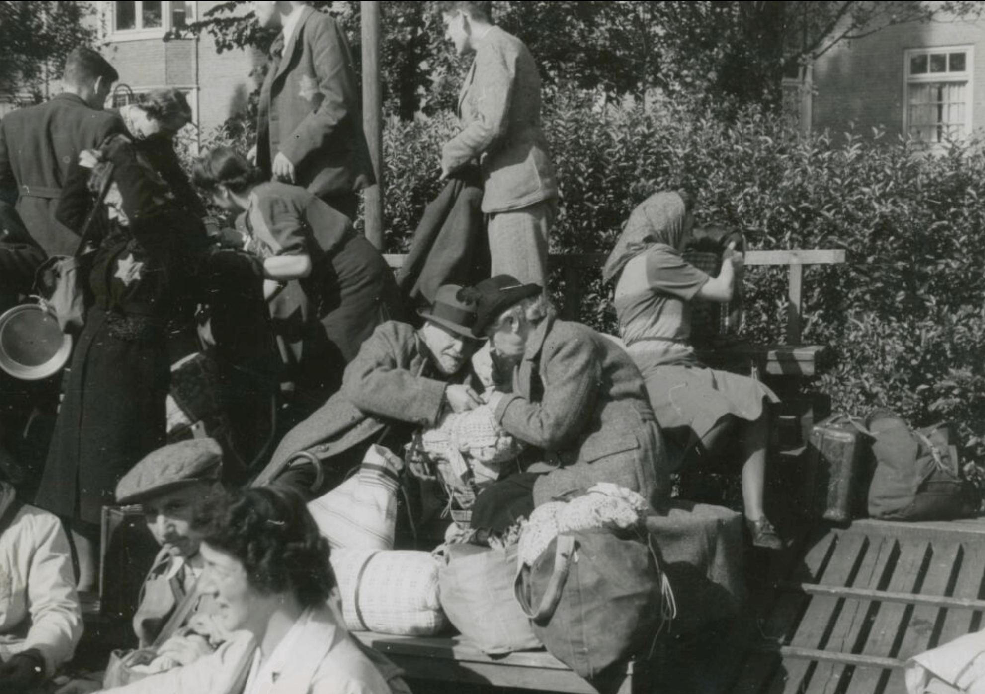(Joden op het sportcomplex op het Amsterdamse Olympiaplein in afwachting van deportatie naar kamp Westerbork, 20 juni 1943. Vervaardiger: Herman Heukels. Auteursrecht: NIOD, CC0)